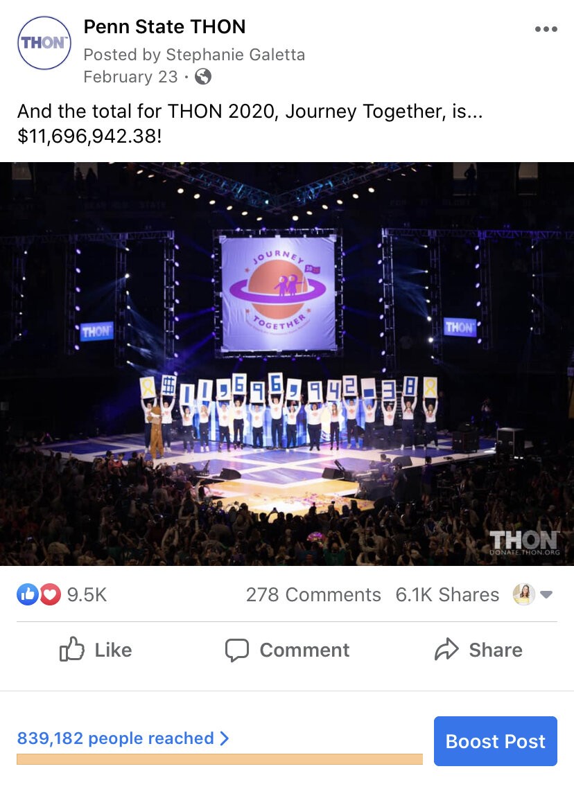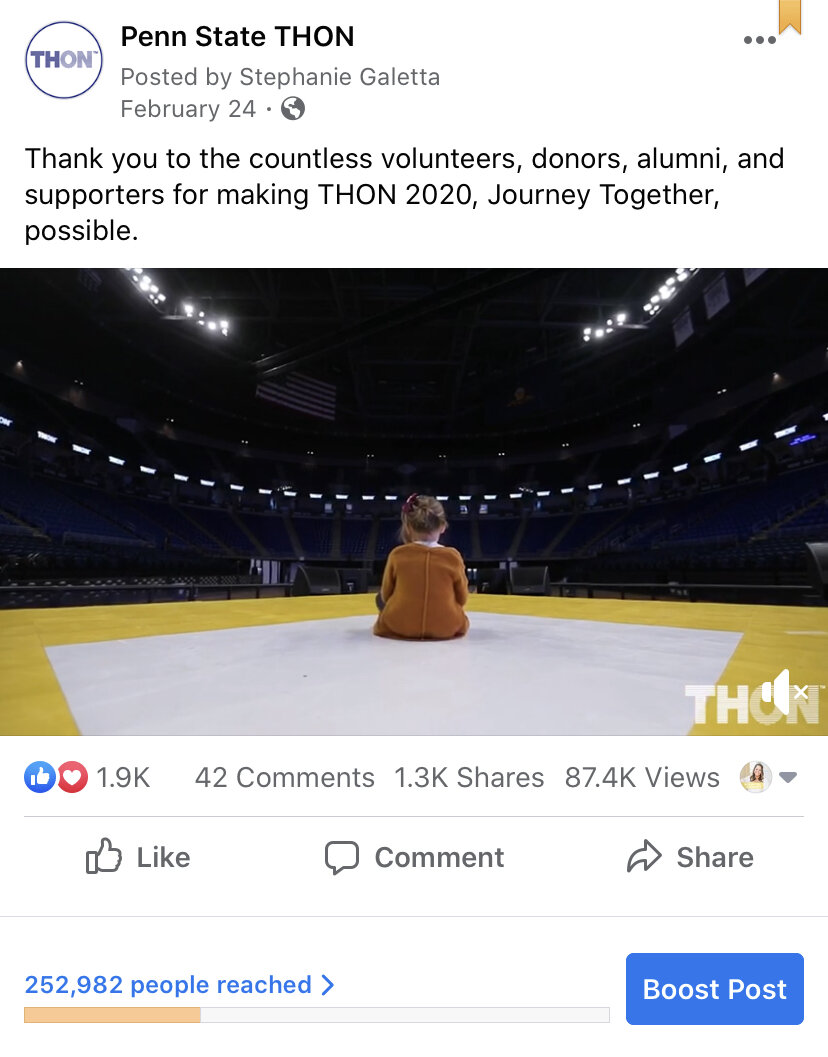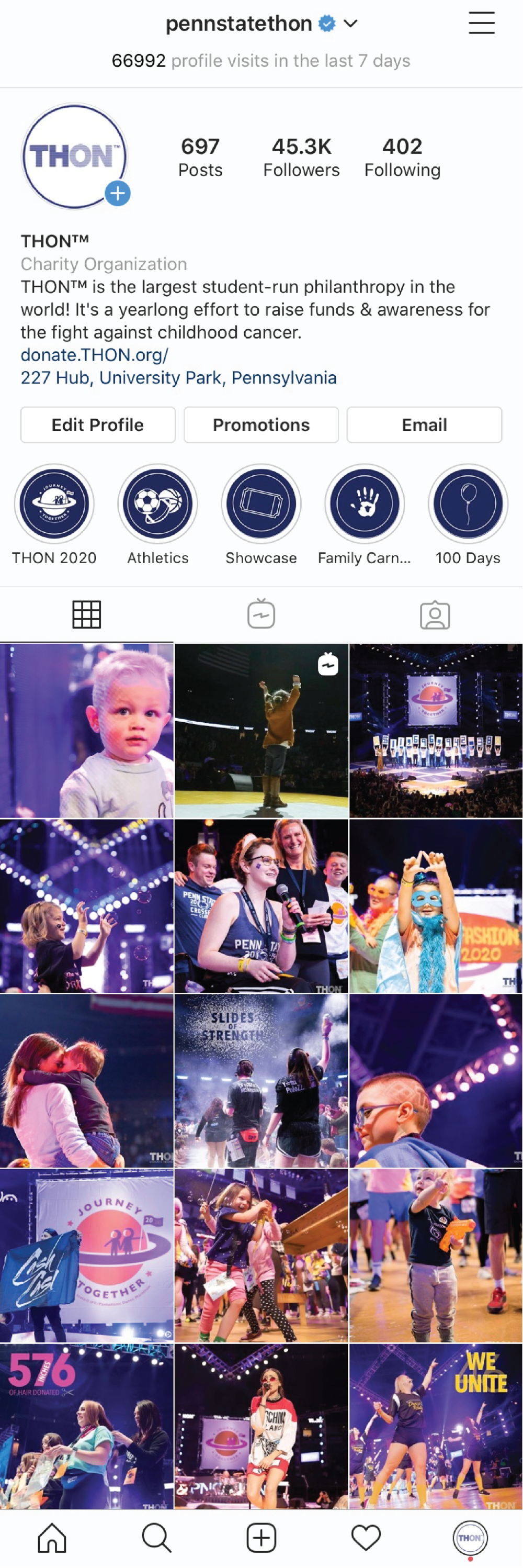 THON™ is the largest student-run philanthropy in the world. Every year, over 16,500 Penn State Students come together to help in the fight against childhood cancer. I was chosen to run their social media platforms during my senior year at Penn State. My role consisted of planning, curating, and posting content as well as tracking and monitoring digital analytics. Below you will find some examples of posts, Instagram stories, and insights from the year.