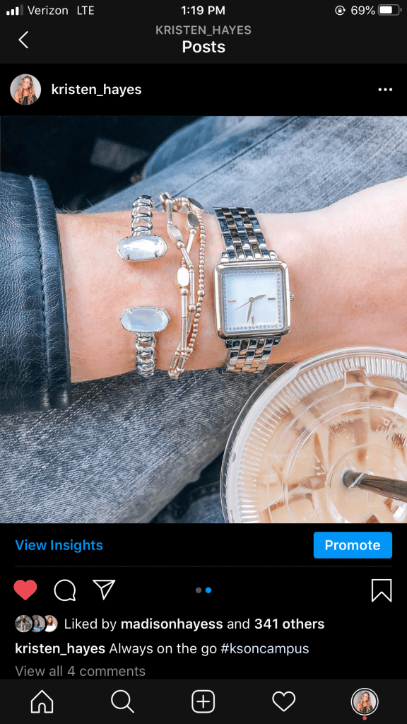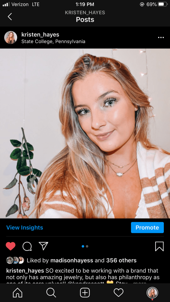I was chosen to be a Kendra Scott Gem my senior year of college (August 2019-June 2020). Through this program, I represented Kendra Scott by posting my own creative content on Instagram and spreading the word about the Kendra Scott brand. I held gifting events with friends on Penn State’s campus, surprised and delighted Kendra Scott lovers on campus and worked with a regional Marketing Coordinator to plan philanthropy events.
