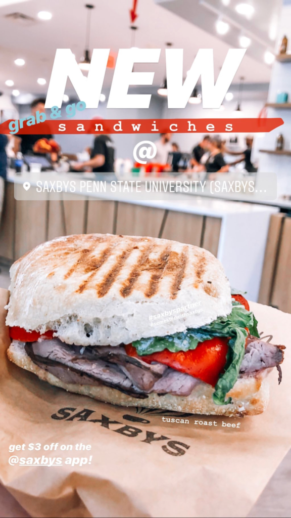 Saxbys is a regional coffee cafe that has a unique business model. Most of their cafes are located in Philadelphia and college campuses and are run by… students! Saxbys opened a location on Penn State’s campus in 2018 – my junior year of college. I was approached by their marketing team and asked to become a student brand ambassador to promote the new location. I posted content on my personal Instagram page and worked with their Marketing Manager on many projects. I took over the Saxbys Instagram account, gave interviews, and gifted coupon cards to friends and classmates. I continued this position until graduation.